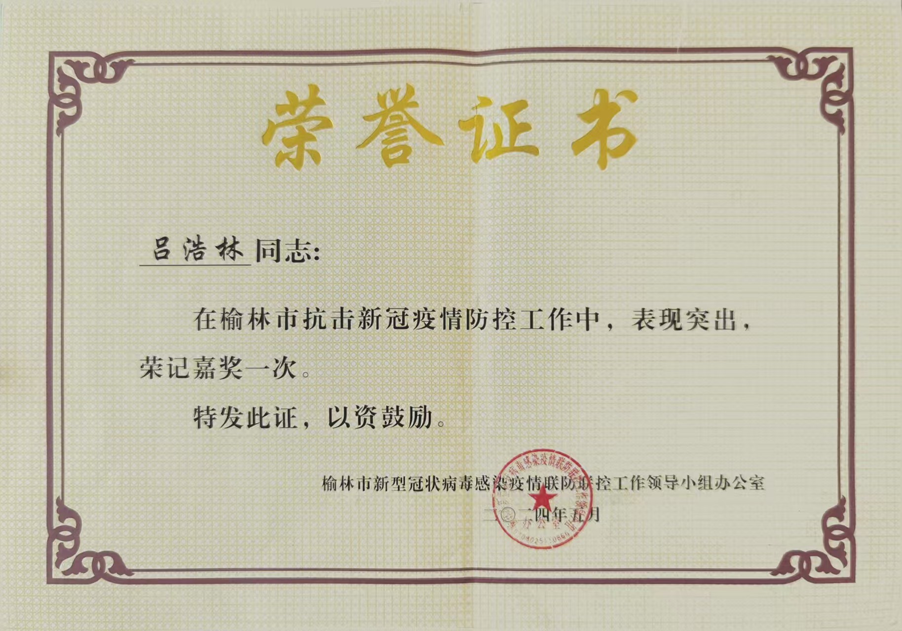 2024年05月01日 荣获 榆林市抗击新冠疫情防控工作嘉奖 地(市、州)级 其他