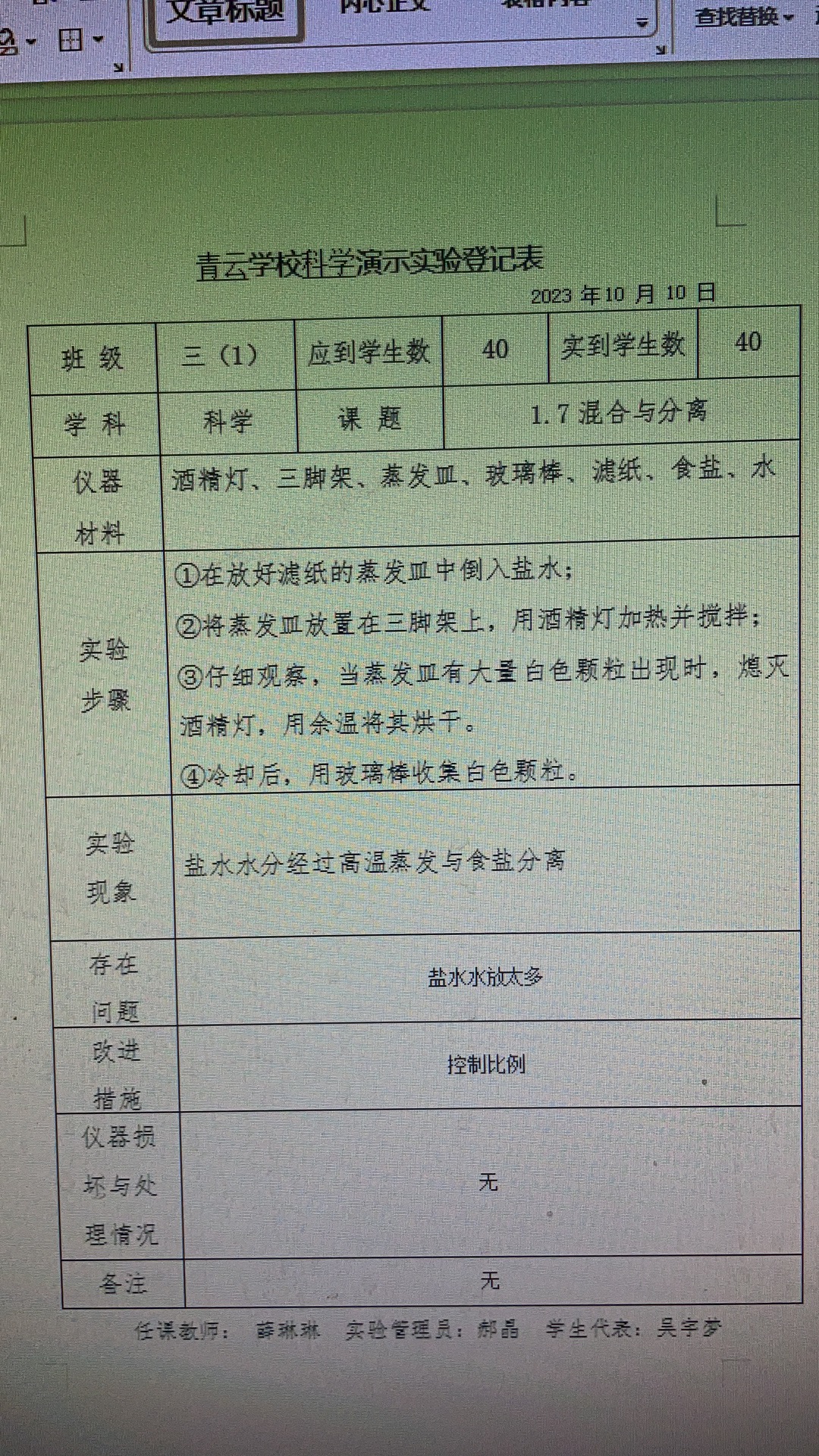 实验登记表