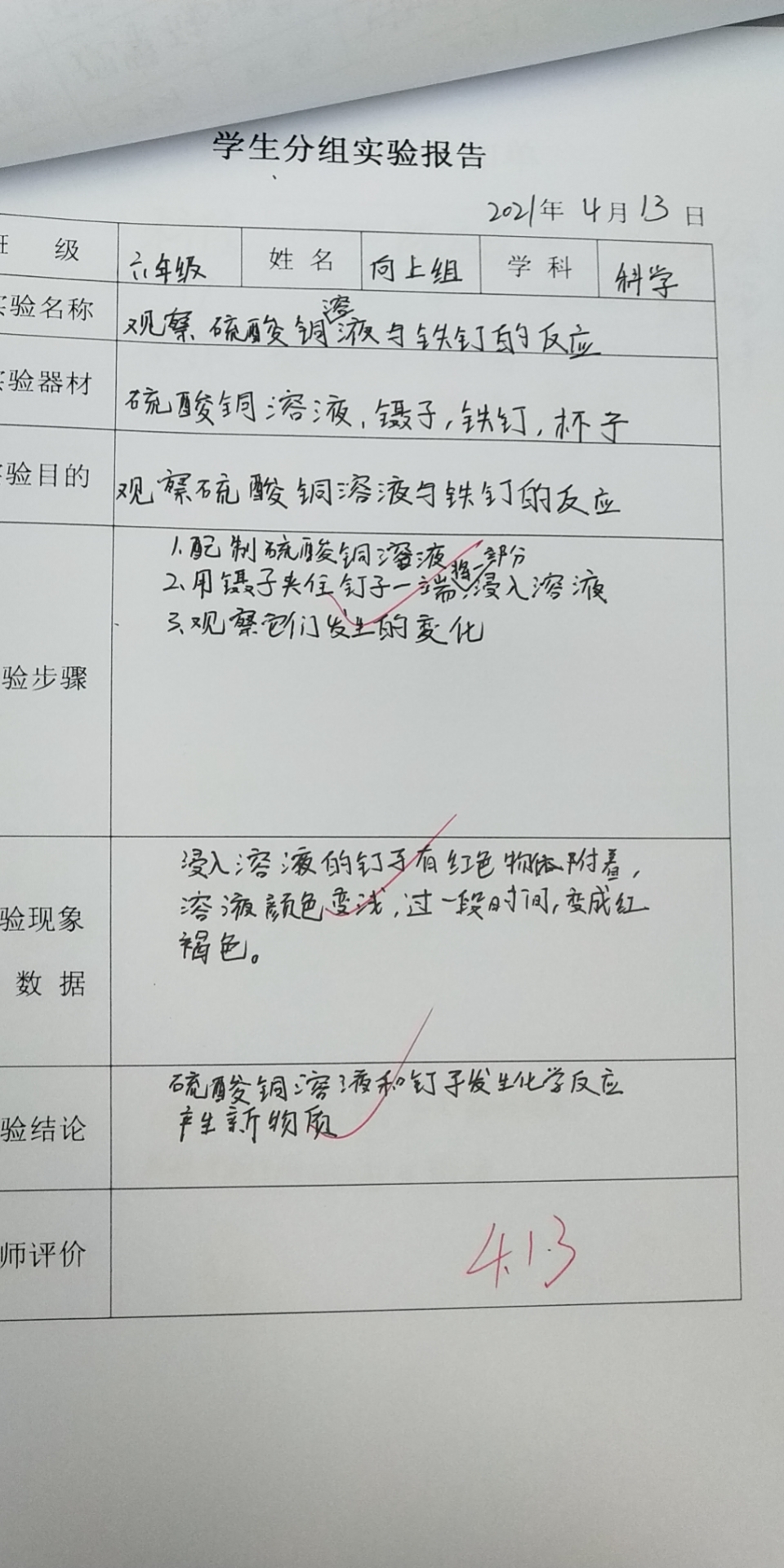 观察硫酸铜溶液与铁钉的反应