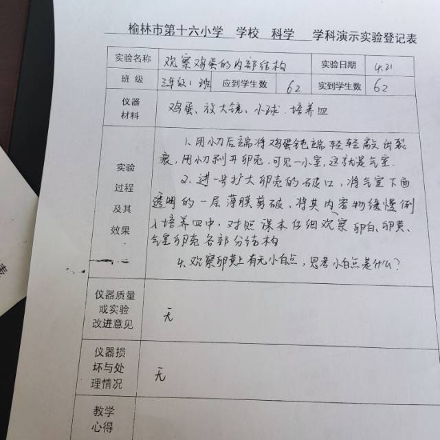 三年级一班 《观察鸡蛋的内部结构》