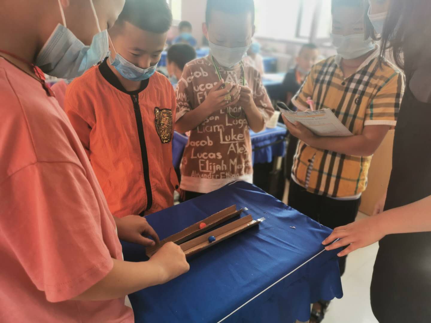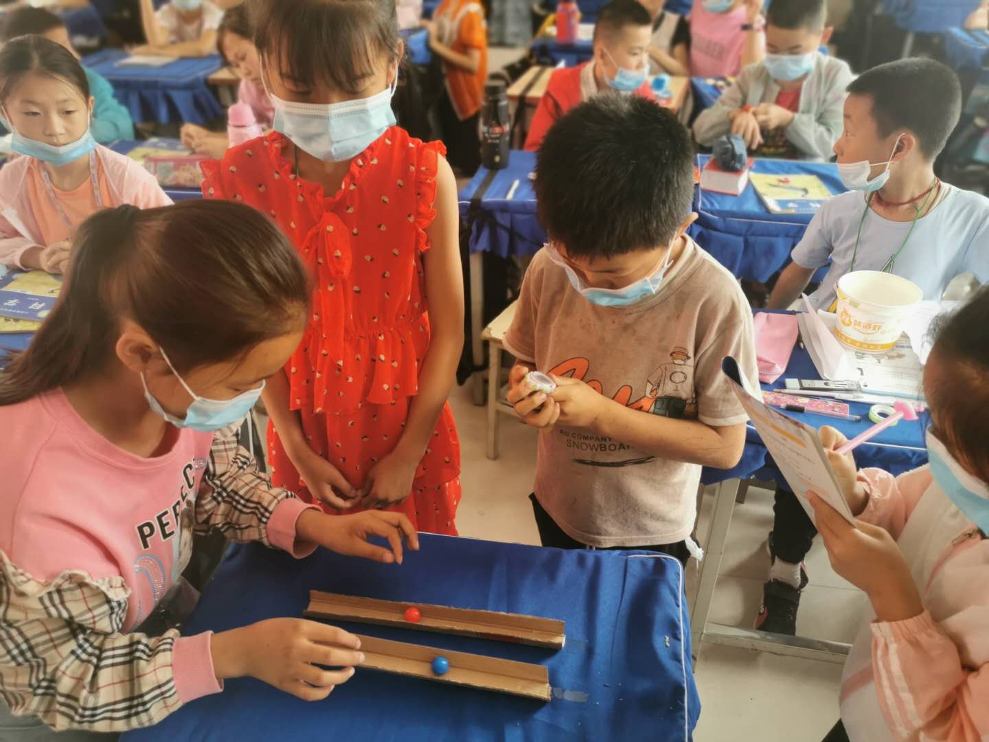 在两条一样长的轨道上,怎样比较不同小球运动的快慢?