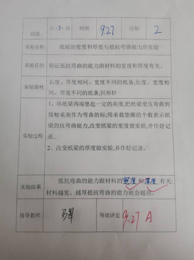纸梁的宽度、厚度与抵抗弯曲的能力测试