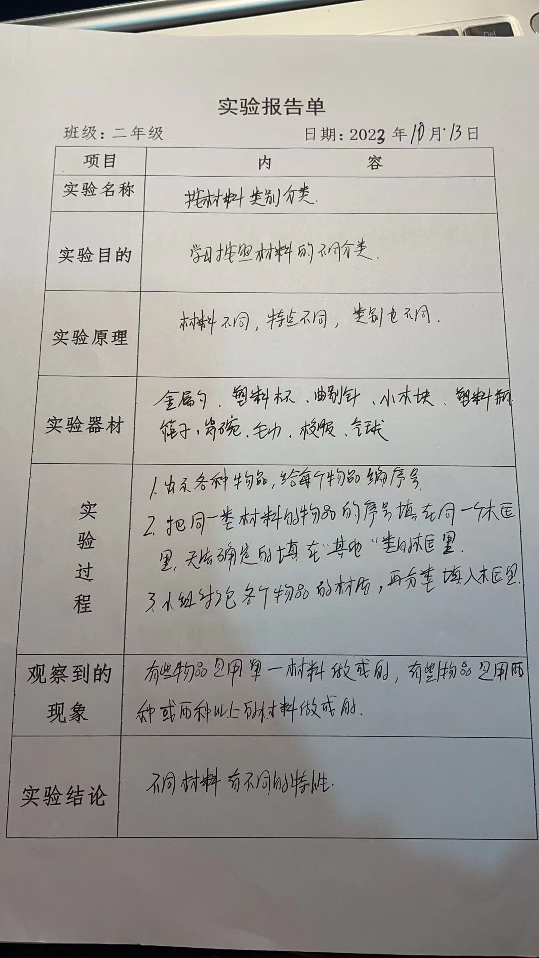 年级科目:二年级科学