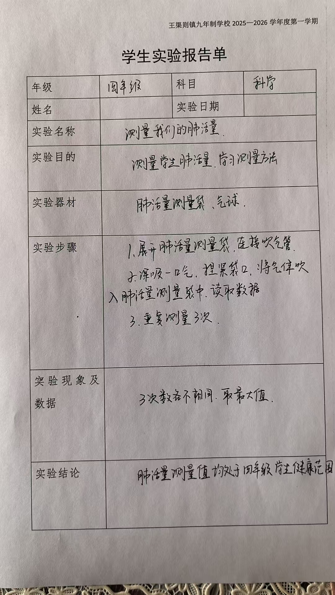 年级科目:四年级科学